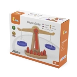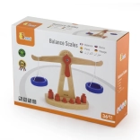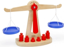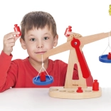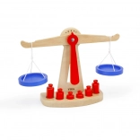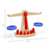 Waga ma naturalny drewniany wygląd z czerwonymi i niebieskimi akcentami, które czynią ją wizualnie atrakcyjną dla każdego dziecka.