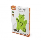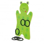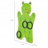 W zestawie drewniana płyta w kształcie żaby i 6 kółek – wystarczy rozpakować i zacząć rzucać.
