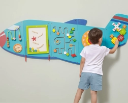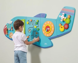 Drewniana tablica ścienna Samolot marki VIGA jest wielofunkcyjną zabawką, składającą się z pięciu części, które razem tworzą kształt samolotu. Każdy element oferuje inny rodzaj aktywności dla zabawnego rozwoju umiejętności dzieci: