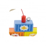 Drewniane elementy są lakierowane i malowane bezpiecznymi dla dzieci farbami w żywych kolorach.