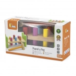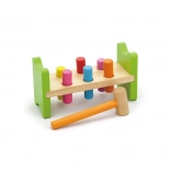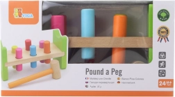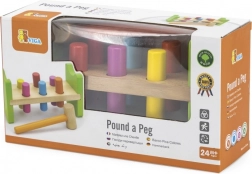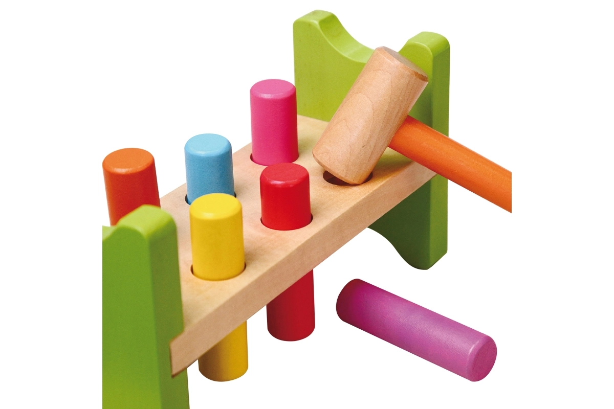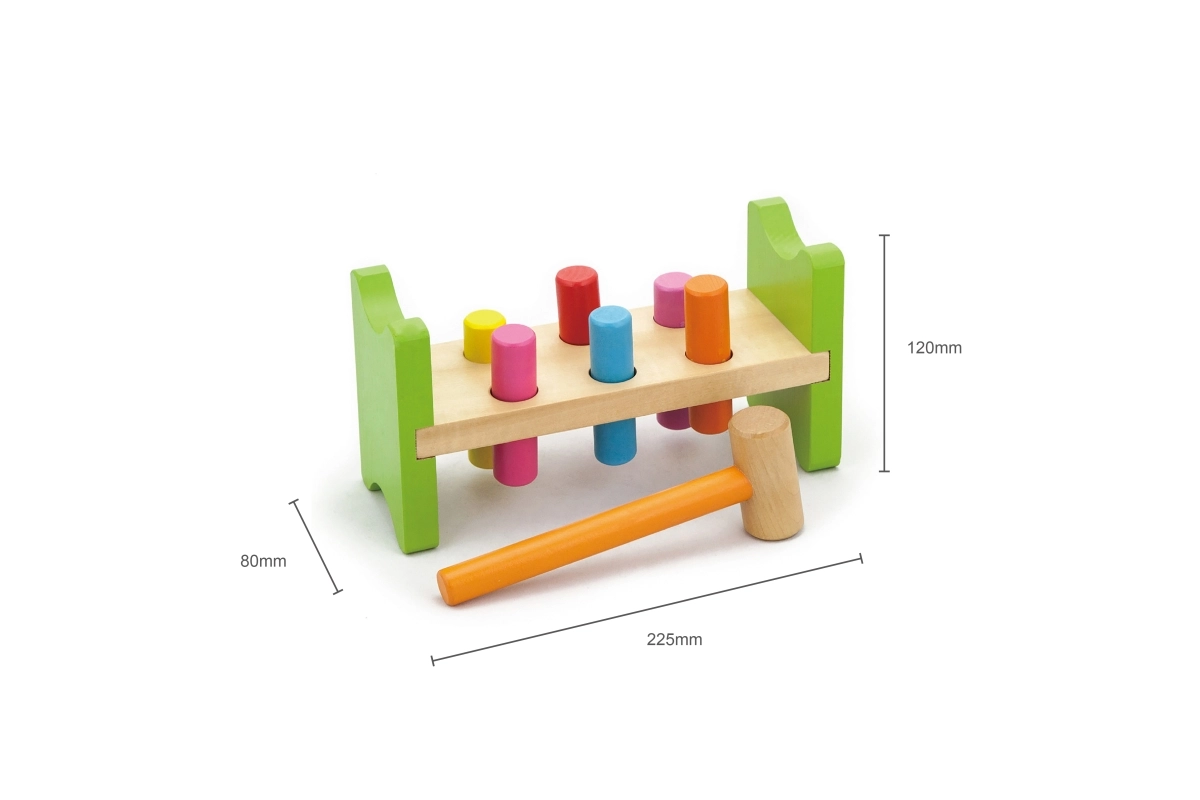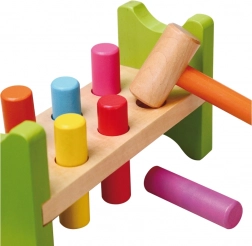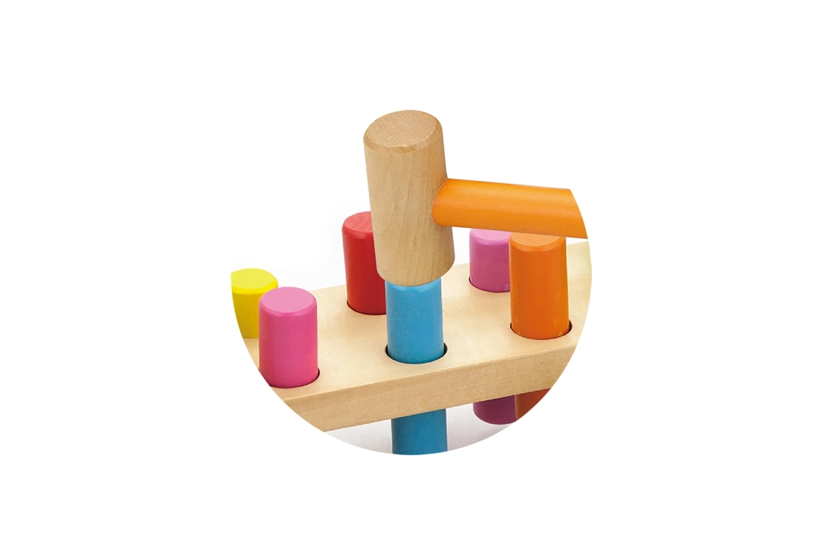 W zestawie znajduje się drewniany młotek i wielobarwne kołki dla długotrwałej zabawy.