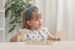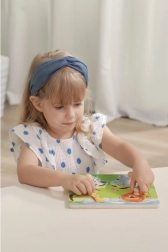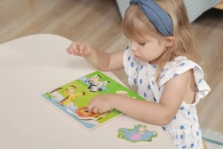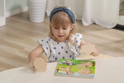 Stabilna drewniana podkładka z frezowanymi krawędziami zapewnia dobre trzymanie elementów, a jednocześnie wspiera percepcję kształtów, cierpliwość i logiczne myślenie. Układanka jest idealna do pierwszego poznawania zwierząt i rozwoju mowy.