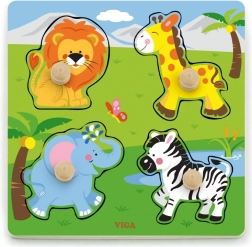 Ta wysokiej jakości drewniana układanka z czterema zwierzętami z zoo oferuje bezpieczną i stymulującą zabawę dla maluchów. Dzięki dużym drewnianym uchwytom dzieci łatwo chwytają każdy element i uczą się poprawnie umieszczać go na miejscu – pomaga w tym także obrazek pod elementem, który prowadzi do sukcesu i radości z ukończenia zadania.