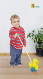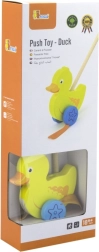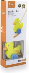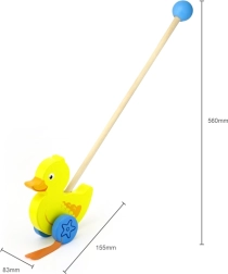 Drewniany pchacz kaczor na kiju to prosta, lecz skuteczna zabawka, którą polubi każde dziecko. To klasyczna zabawka przynosząca wiele korzyści. Uroczy żółty kaczor podczas ruchu energicznie porusza nóżkami, co motywuje dzieci do spacerów. Zabawka jest zapakowana w estetyczne pudełko z okienkiem, które umożliwia zobaczenie kaczuszki. W środku znajduje się kij z uchwytem, idealnie dopasowany do małej rączki dziecka. Kij nie jest trwale przymocowany, co ułatwia jego przechowywanie. Cała zabawka wykonana jest z drewna bukowego i pomalowana nietoksycznymi farbami w żywych kolorach, które przyciągają uwagę i zachęcają do zabawy, dostarczając mnóstwo radości.