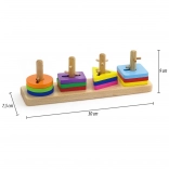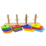 Dzięki układaniu różnych kształtów na drewnianych bolcach zabawka wspiera rozwój małej motoryki i koordynacji ręka–oko.