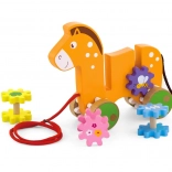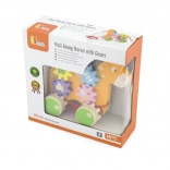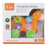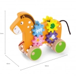 Konik ma barwne zębate kółka, które obracają się podczas poruszania zabawką, co pomaga małym dzieciom rozwijać ich umiejętności motoryczne.