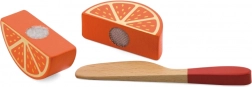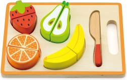 Ten wysokiej jakości drewniany zestaw zapewnia bezpieczną zabawę w gotowanie: poszczególne kawałki owoców są połączone rzepem, dzięki czemu dzieci mogą je wielokrotnie „kroić” i ponownie łączyć. Realistyczne wykonanie pomaga w nauce rozpoznawania kształtów i kolorów, ćwiczy chwyt i koordynację oraz rozwija wyobraźnię podczas zabaw w kucharza.