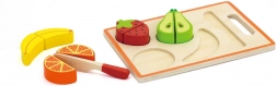 Zestaw zawiera deseczkę, drewniany nożyk i różnorodne kolorowe owoce, idealnie dopasowane do dziecięcych dłoni. Solidne drewniane wykonanie i gładkie krawędzie gwarantują długą trwałość i bezpieczną zabawę.