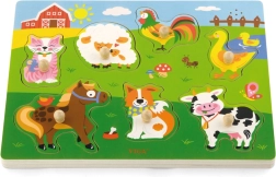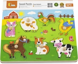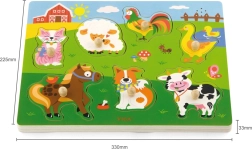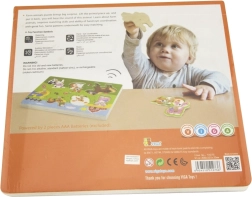 Drewniana układanka ze zwierzątkami, dźwiękowa. Po umieszczeniu właściwego zwierzątka rozlega się dźwięk, który to zwierzątko wydaje. Wymiary planszy ok. 30 × 22,5 × 2 cm. Zasilanie: 2 × bateria AAA (brak w zestawie). Wymiary opakowania ok. 30 × 27 × 2 cm. Wiek: 18m+.