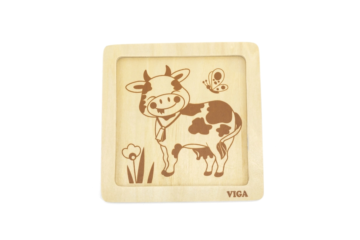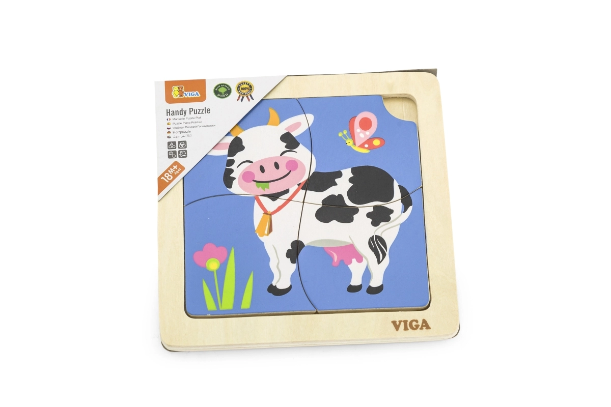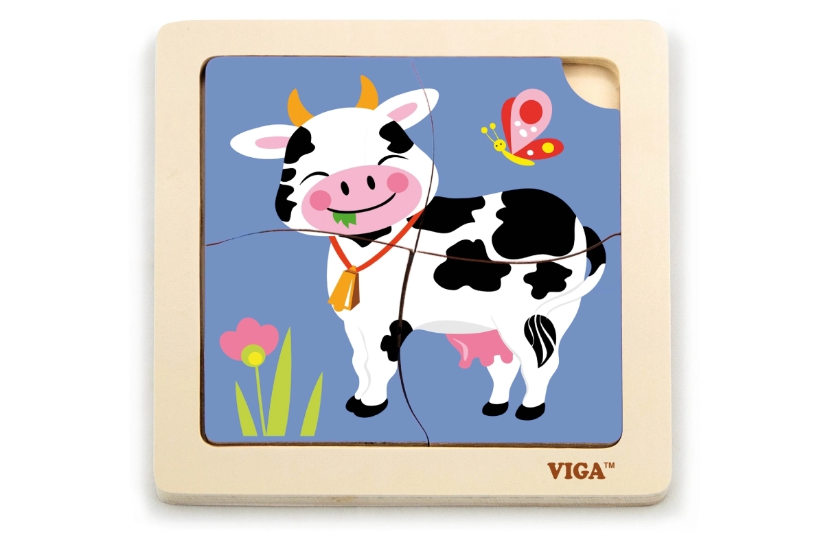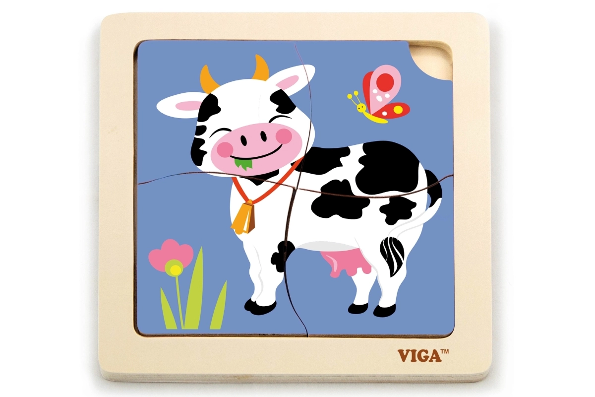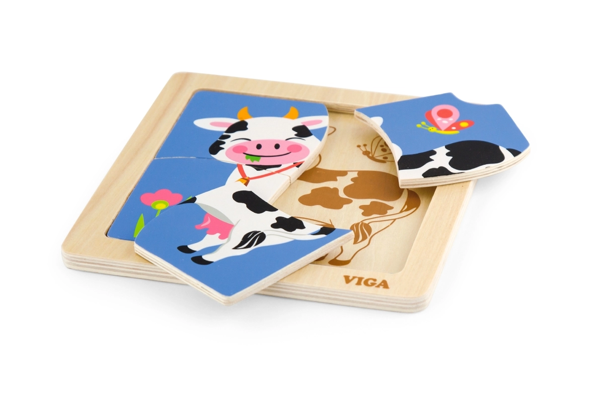Drewniana układanka krówka marki Viga zapewnia najmłodszym świetny sposób na naukę rozpoznawania kształtów i rozwój motoryki małej. Zestaw zawiera 4 elementy układanki oraz obrazek, który pomaga dziecku w dopasowywaniu części. Puzzle są starannie wykonane z bezpiecznych drewnianych materiałów i malowane żywymi, nietoksycznymi farbami. Każda zabawa tą układanką będzie dla Twojego dziecka pełna radości i rozwoju.
