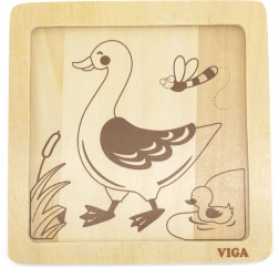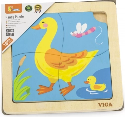 Drewniane puzzle Viga zawierają cztery tematyczne elementy, które łatwo montuje się na tablicy z obrazkiem. Każdy element wykonany jest z wysokiej jakości drewna i malowany bezpiecznymi, nietoksycznymi farbami, co zapewnia bezpieczeństwo dzieci oraz środowiska.