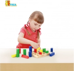- drewniana podstawa z kołkami oraz zestaw kolorowych elementów geometrycznych
