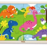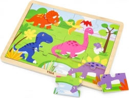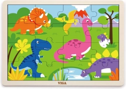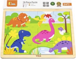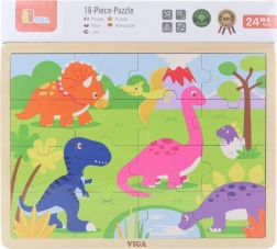Odkryj wysokiej jakości drewniane puzzle VIGA z dinozaurami, które zapewnią dzieciom pierwszą radość z układania. 16 elementów trenuje małą motorykę, koordynację ręka–oko oraz logiczne myślenie. Elementy można układać na drewnianej planszy z ramką lub układać obrazek także bez ramki. Wymiary ułożonego puzzle to ok. 27,5 × 20 cm, odpowiednie od 24 miesięcy.