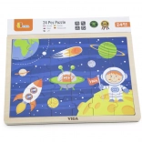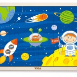 Drewniane puzzle VIGA z motywem kosmosu przynoszą dzieciom od najmłodszych lat radość z odkrywania. Kolorowe ilustracje z rakietą, astronautą i planetami naturalnie wspierają rozpoznawanie kształtów i kolorów oraz rozwój koordynacji oko–ręka. Ułożone puzzle mają wymiary ok. 27,5 × 20 cm, dzięki czemu świetnie mieszczą się na stole i w kąciku zabaw.