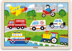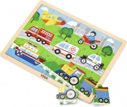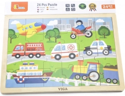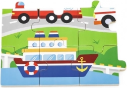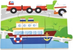 Ta drewniana układanka z obrazkami środków transportu to świetny wybór na pierwsze „większe” puzzle. Dzięki 24 elementom układanie stanowi akuratne wyzwanie – wspiera koncentrację i radość z ukończonego obrazka o wymiarach ok. 27,5 × 20 cm. Kolorowe ilustracje pojazdów (karetka, wóz strażacki, radiowóz, statek, samolot itp.) naturalnie motywują dzieci do powtarzania zabawy.