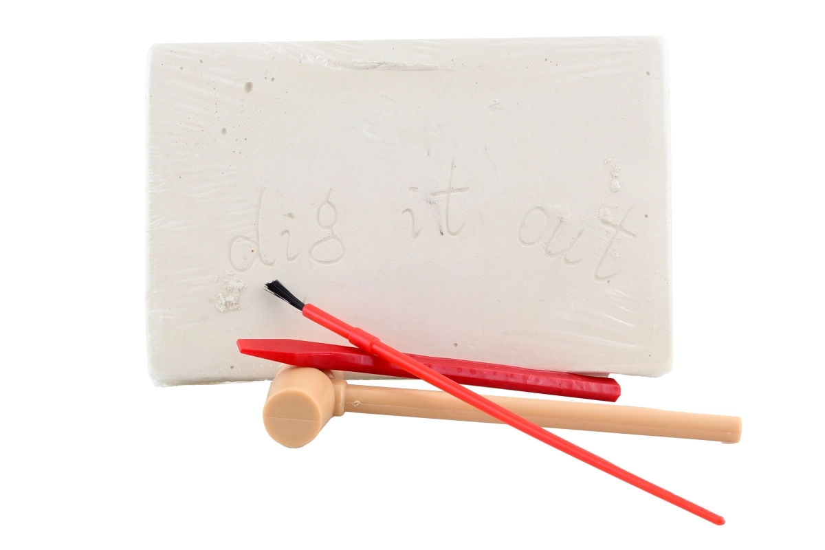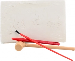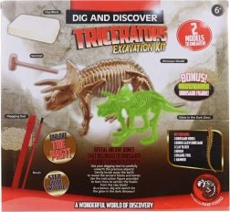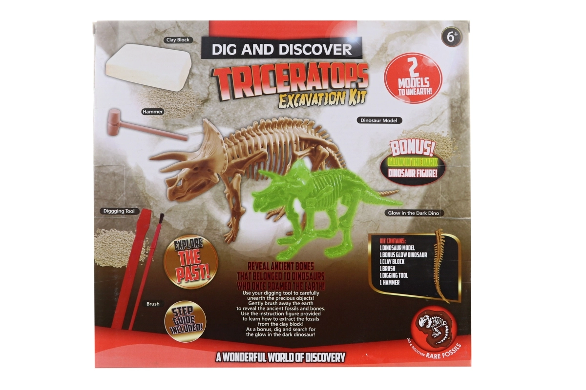 - Blok do rzeźbienia, młoteczek, pędzelek, narzędzie do rzeźbienia, szkielet triceratopsa (10 części), figurka świecąca w ciemności