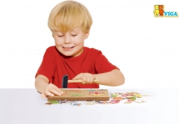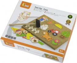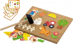 Kreatywna korkowa tablica do wbijania z motywem farmy marki Viga rozwija małą motorykę, logiczne myślenie i kreatywność dzieci od 3 lat. Dzięki 24 drewnianym elementom, korkowej tablicy, małemu młoteczkowi i pinezkom dzieci tworzą własne scenki farmerskie według wyobraźni lub gotowych wzorów. Bezpieczne zaokrąglone krawędzie i trwałe wykonanie gwarantują mnóstwo zabawy i nauki.