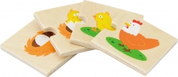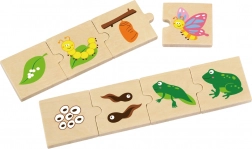 Ten zestaw drewnianych „rosnących” puzzli uczy dzieci rozumieć cykle życia zwierząt i roślin – od nasionka lub jajka aż do dorosłości. Każdy motyw tworzy sekwencję elementów, które logicznie do siebie pasują, pomagając w naturalny sposób trenować małą motorykę, postrzeganie zależności oraz koordynację oko–ręka.