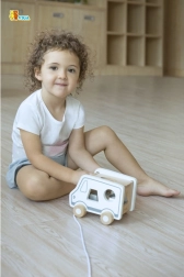 Ta drewniana zabawka do ciągnięcia w kształcie ciężarówki łączy dwie ulubione aktywności – ciągnięcie na sznurku i wkładanie kształtów. Dzieci rozwijają rozpoznawanie kształtów i percepcję przestrzenną, jednocześnie ciesząc się ruchem i zabawą wyobraźni z uroczym autkiem.