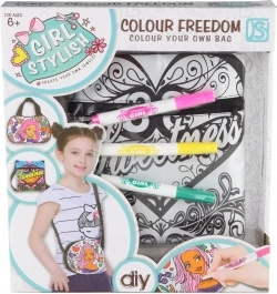 Kreatywna kolorowanka–torebka dla dzieci od 3 lat zawiera 3 specjalne pisaki do tkanin oraz płócienną torebkę o wymiarach ok. 16 × 18 cm. Świetna aktywność wspierająca rozwój kreatywności, małej motoryki i radość z własnoręcznie stworzonego designu.