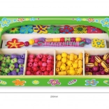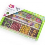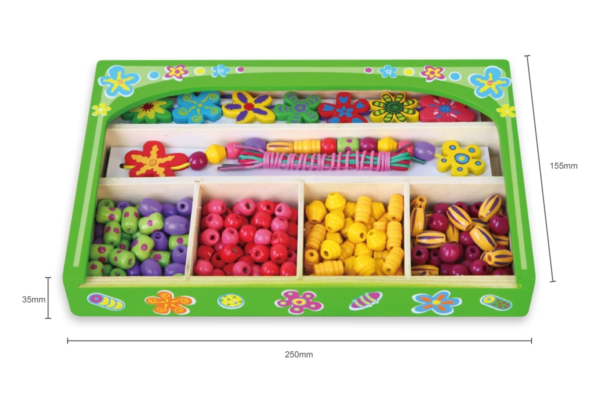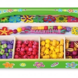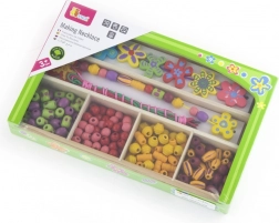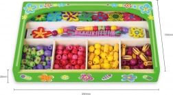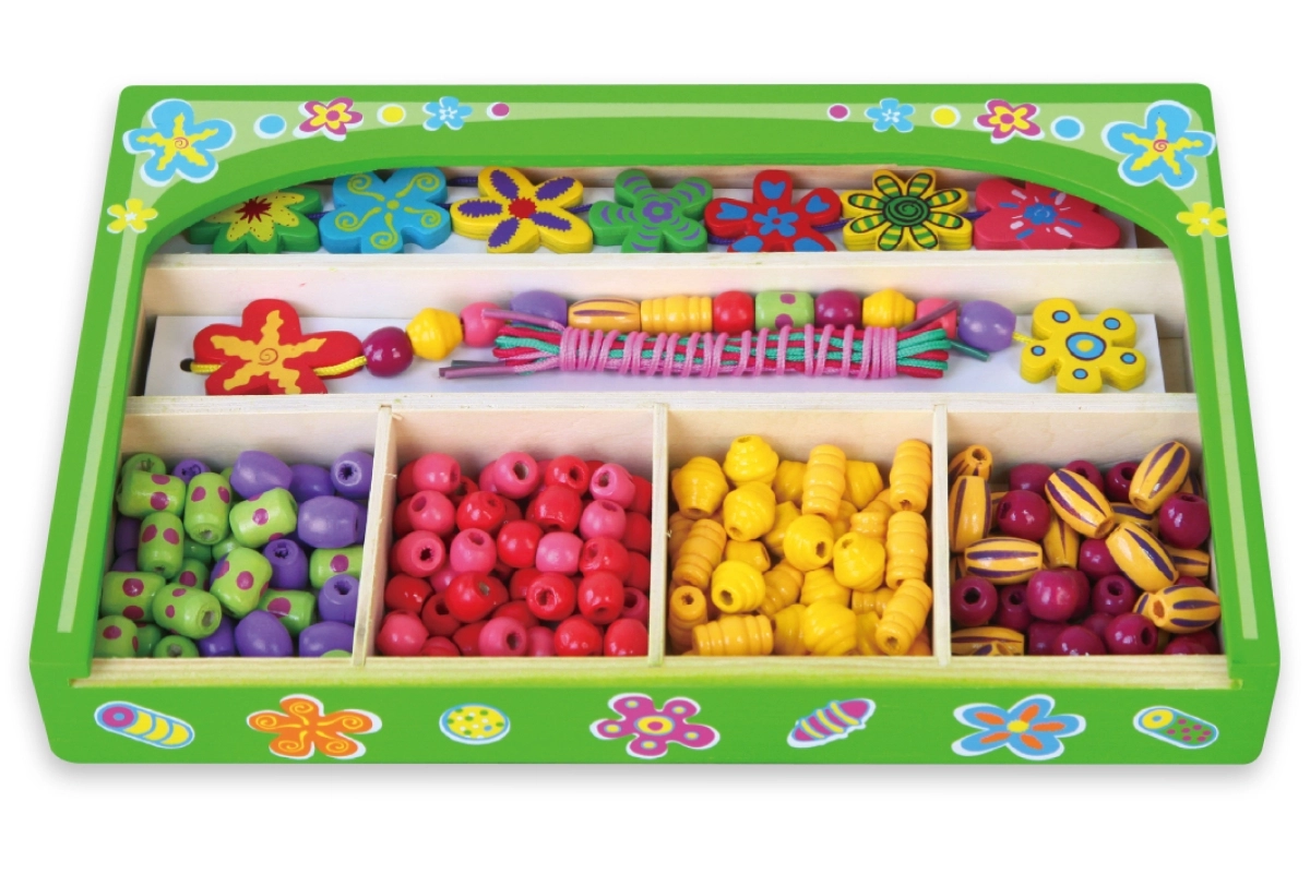 Ten drewniany zestaw koralików zapewni dzieciom godziny zabawy przy tworzeniu oryginalnych naszyjników i bransoletek. W pudełku znajdziesz kolorowe koraliki o różnych kształtach i rozmiarach, w tym kwiatowe ozdoby, oraz sznureczki do łatwego nawlekania. Dzięki przejrzystym przegródkom wybór koralików jest prosty, a tworzenie naturalnie wspiera koncentrację i twórczą ekspresję.
