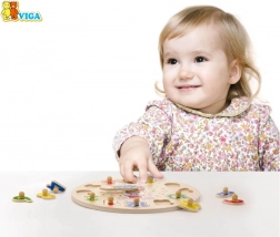 Zabawny i bezpieczny drewniany zegar edukacyjny, który pełni także funkcję układanki. Dzieci dzięki 12 kolorowym elementom z uchwytami ćwiczą liczby 1–12 oraz podstawy odczytywania czasu, rozwijają małą motorykę, myślenie logiczne i rozpoznawanie kolorów i kształtów. Średnica ok. 30 cm, odpowiedni od 24 miesięcy.