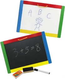 Ta uniwersalna tablica łączy dwie kreatywne powierzchnie w jednej – czarną magnetyczną stronę do kredy oraz białą suchościeralną stronę do markera. Dzieci mogą pisać, rysować i ćwiczyć literki oraz cyfry; na czarnej stronie dodatkowo łatwo przymocują magnesy. W zestawie znajdziesz wszystko do natychmiastowego użycia: 4 kredy, marker suchościeralny i gąbkę.