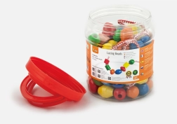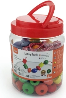 Plastowe pudełko zawiera duże drewniane koraliki oraz kolorowe sznurówki, na które można je nawlekać. Wymiary koralika ok. 2 × 2 cm w zależności od rodzaju. Wymiary opakowania ok. 16 × 12 cm. Zawiera 90 koralików i 5 sznurków. Wiek 3+.