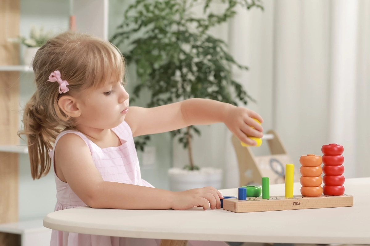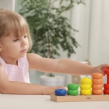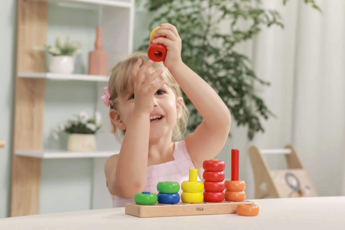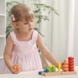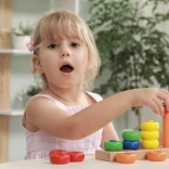 Nawlekanie krążków wspiera precyzję ruchów, cierpliwość i koncentrację – idealne dla przedszkolaków.