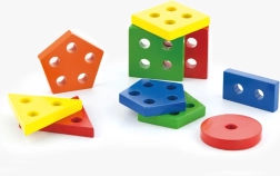 Zestaw zawiera wyraźnie kolorowe elementy geometryczne, które dzieci łatwo chwytają i sortują według kształtu oraz koloru.