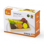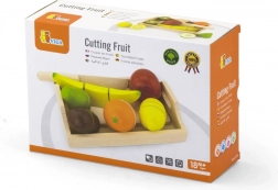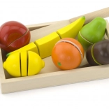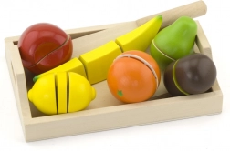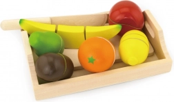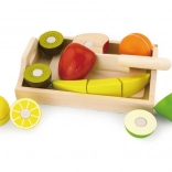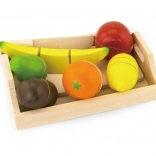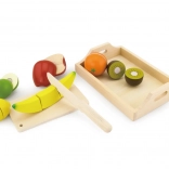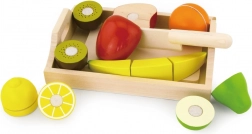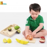 Owoce i nóż wykonane są z naturalnego drewna, co zapewnia bezpieczeństwo i trwałość podczas zabawy.