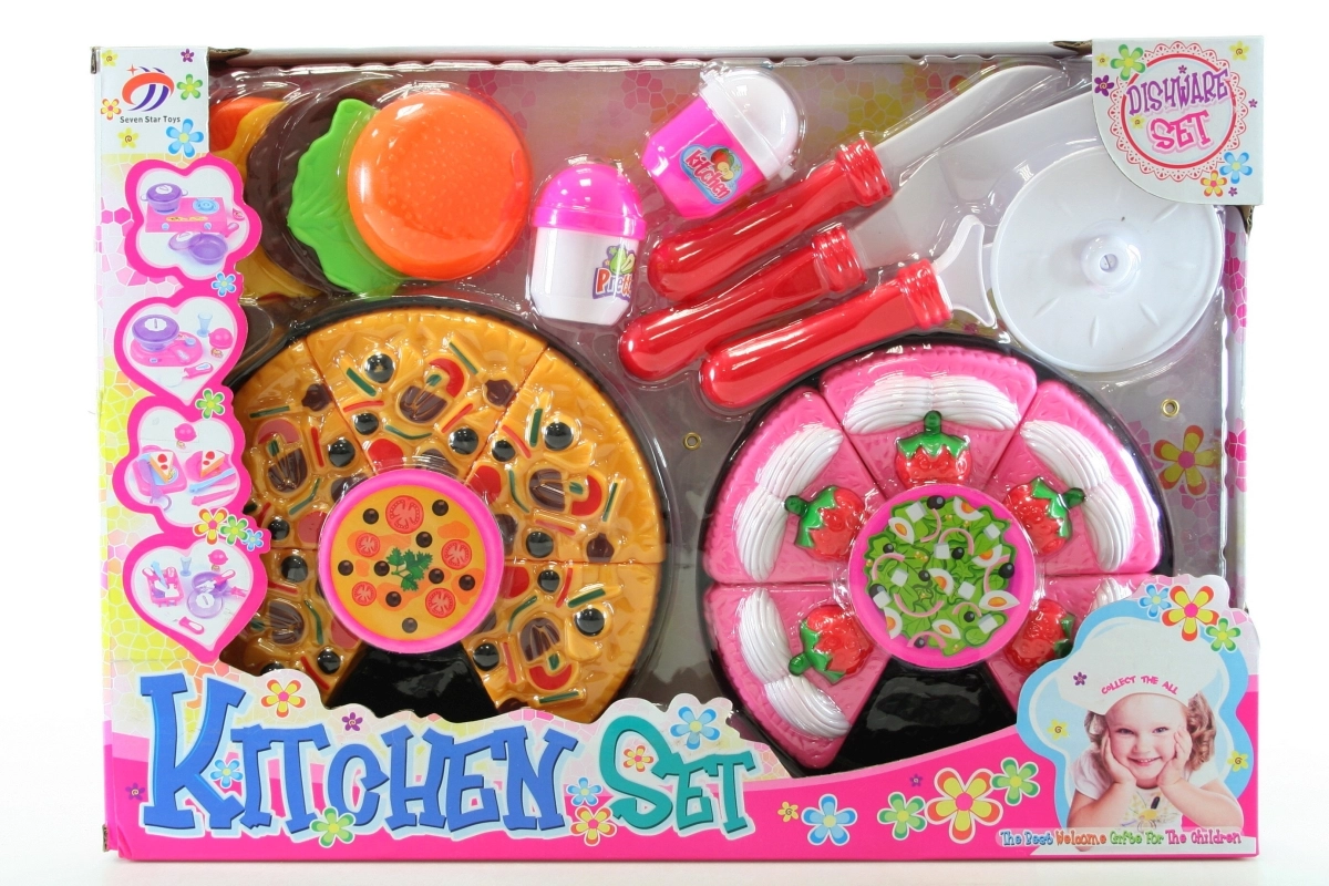 Zabawny plastikowy zestaw dla małych kucharzy zawiera placek i tort krojone na kawałki, hamburger, solniczkę, pieprzniczkę oraz akcesoria kuchenne. Idealny do zabawy w gotowanie i rozwój motoryki. Bezpieczne wykonanie z plastiku, realistyczne dodatki i łatwe krojenie na kawałki ucieszą dzieci od 3 lat.