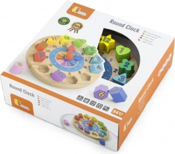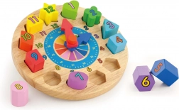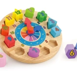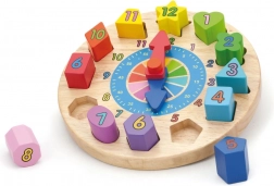 Zabawny i edukacyjny drewniany zegar dla najmłodszych pomaga uczyć się rozpoznawać czas, kolory i kształty. Zawiera 12 kolorowych elementów do układania z cyframi, które rozwijają małą motorykę, logikę i koordynację oko–ręka. Idealna zabawka dla dzieci od 24 miesięcy.