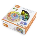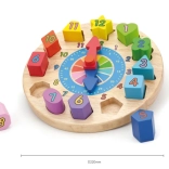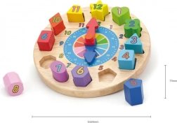 Zegar ma kompaktowe wymiary około 22 × 6 cm, a w zestawie znajduje się 12 różnych kształtów w żywych kolorach z oznaczonymi cyframi. Świetny pomocnik do pierwszego zapoznania z pojęciem czasu oraz do rozwoju cierpliwości i koncentracji.