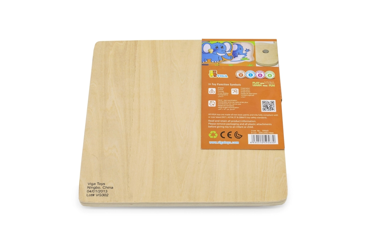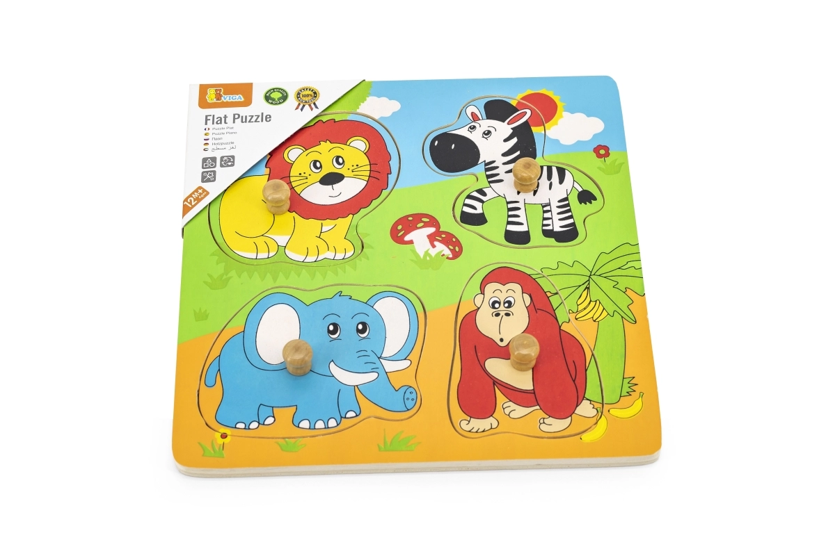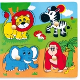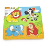Ta wysokiej jakości drewniana wkładanka z motywem safari to idealna pierwsza układanka dla maluchów. Każdy element ma drewniany kołeczek do łatwego chwytania małymi rączkami oraz odpowiednią sylwetkę na płycie bazowej dla łatwiejszej orientacji.