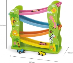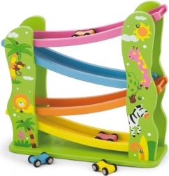 Ta pięknie kolorowa drewniana zjeżdżalnia jest idealna dla najmłodszych, którzy chcą się bawić i jednocześnie rozwijać swoje umiejętności. Zawiera rampę z kilkoma poziomami w różnych kolorach i umożliwia samochodzikiom płynny ruch po torze.