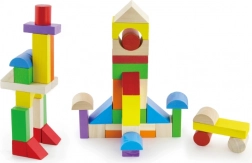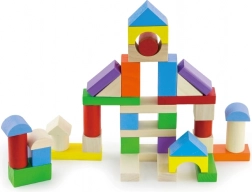 Klocki w formie prostopadłościanów, kostek, walców i łuków (wielkość 2,5–7,5 cm) inspirują do tworzenia wież, mostów i całych miasteczek.
