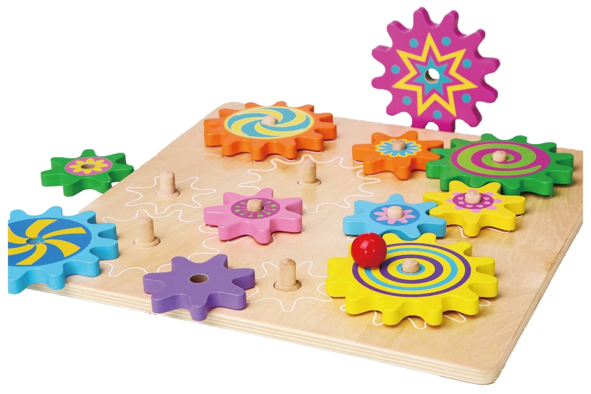 Jedno obrócenie wprawia w ruch cały układ. Dzieci intuicyjnie rozumieją, jak współpracują ze sobą zębate kółka i co powoduje ich ruch.