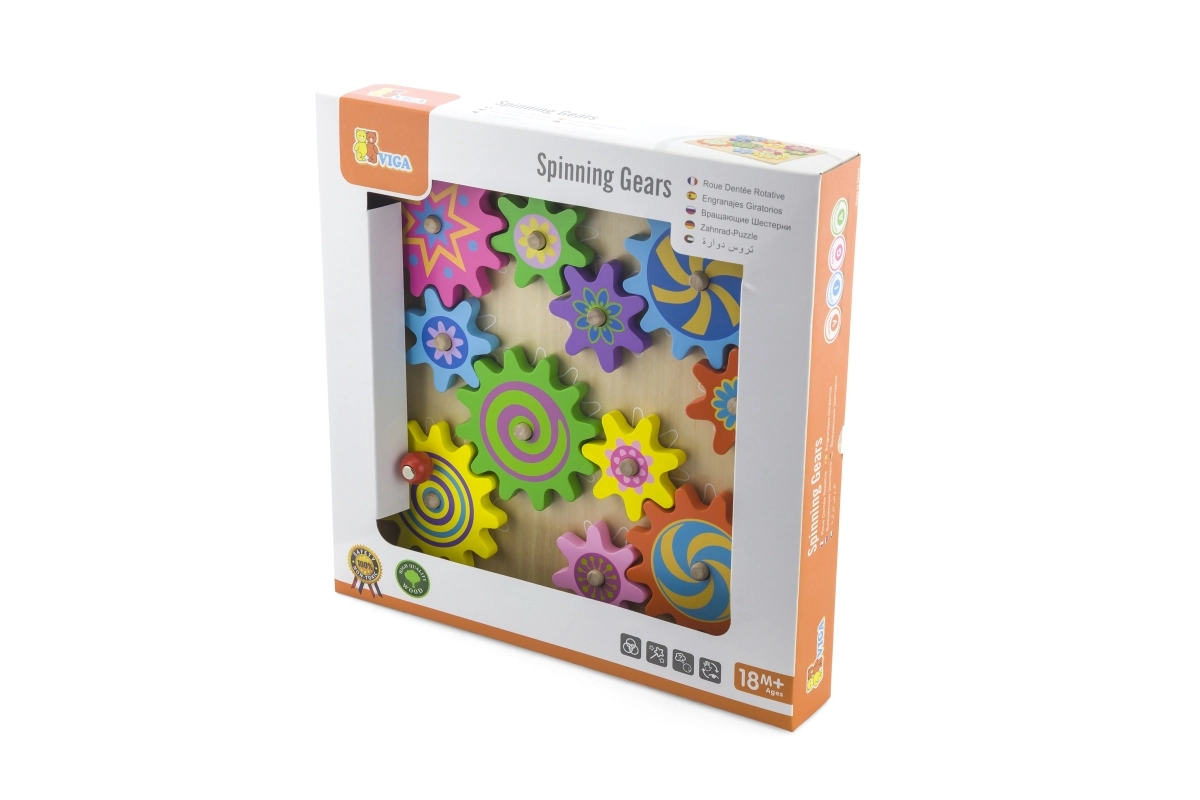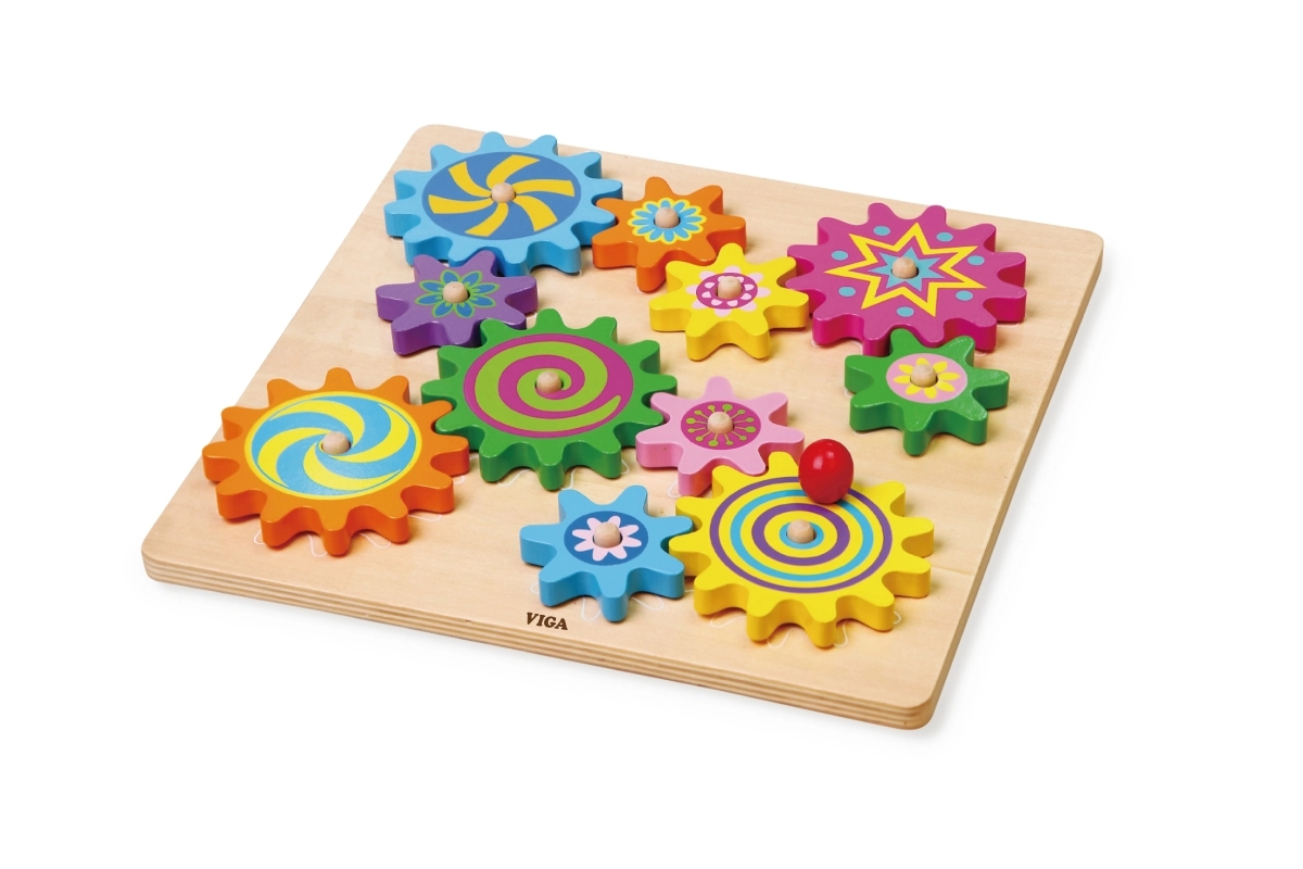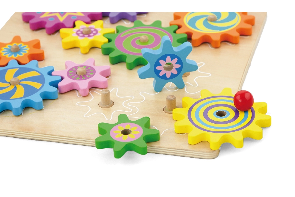 Ten kolorowy zestaw drewnianych zębatych kółeczek na stabilnej podstawie ucieszy małych odkrywców. Dzieci umieszczają kółeczka na kołkach, testują ich połączenia i obserwują, jak po obróceniu jednego kółeczka wszystkie płynnie zaczynają się poruszać. Zabawka wspiera koordynację ręka–oko, myślenie logiczne oraz naukę przyczyny i skutku.