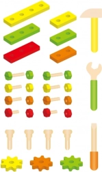 W skład zestawu wchodzą śrubokręt, młotek, klucz, śruby, nakrętki i listewki, które pozwalają na nieskończone kombinacje i projekty.