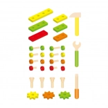 Wszystkie komponenty są dopasowane do dziecięcych dłoni i wykonane z trwałego drewna. Dzięki bogatemu zestawowi śrub, nakrętek i listewek powstają nieskończone możliwości kombinacji, które rozwijają wyobraźnię i cierpliwość. Zestaw doskonale nadaje się do samodzielnej zabawy i wspólnego tworzenia z rodzicami.