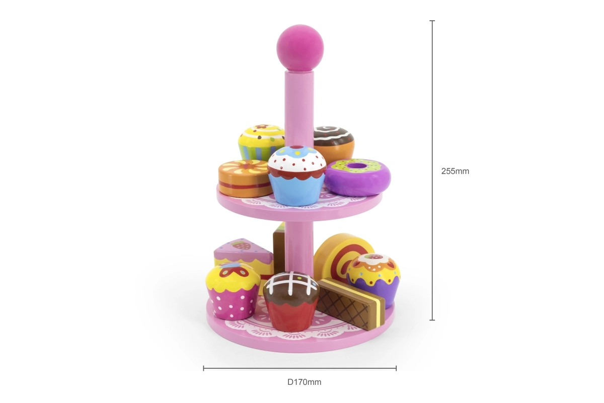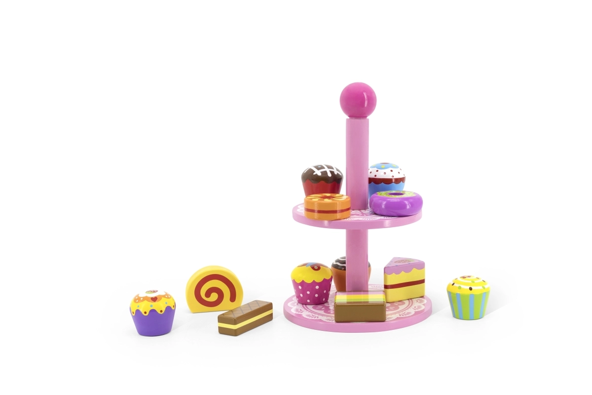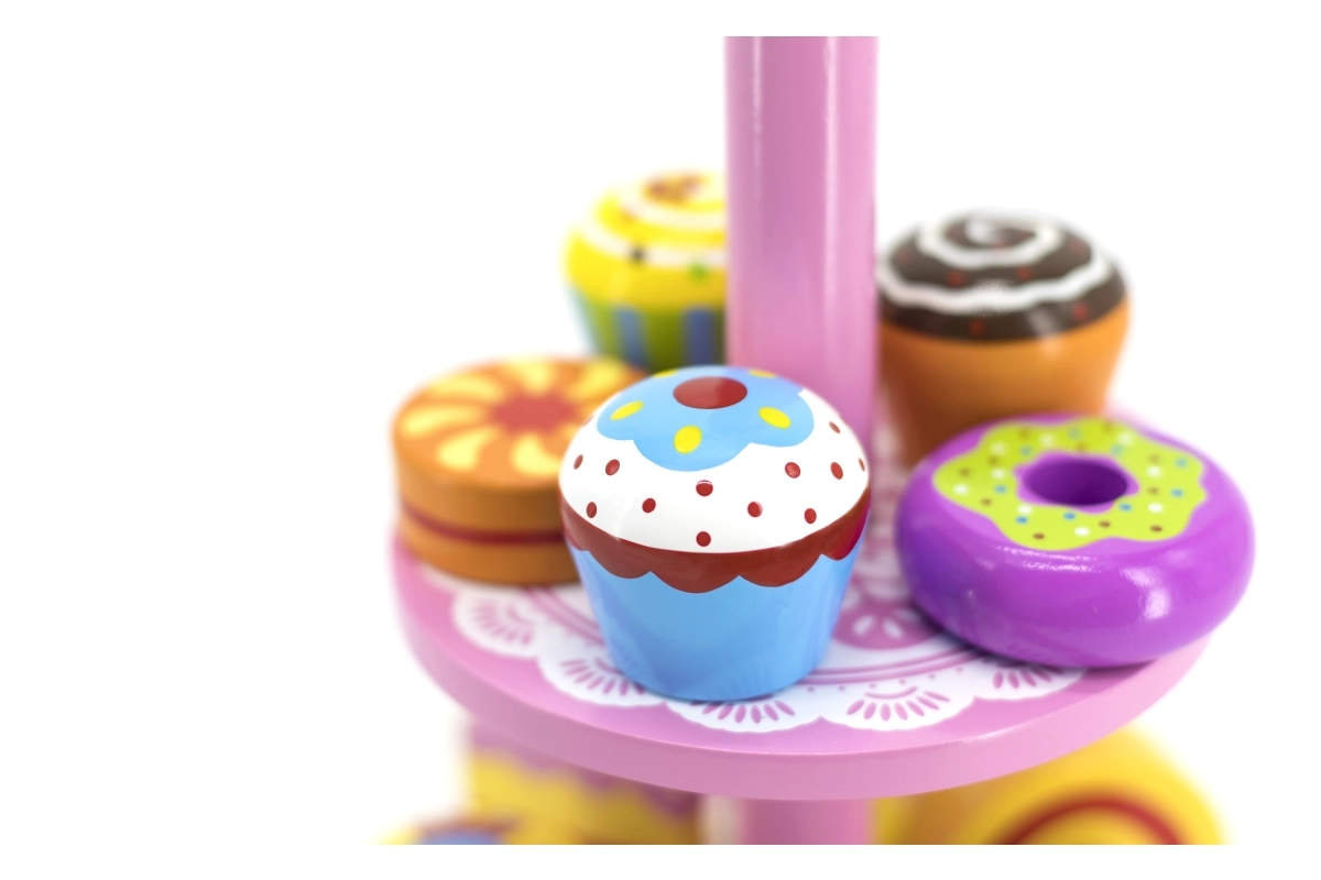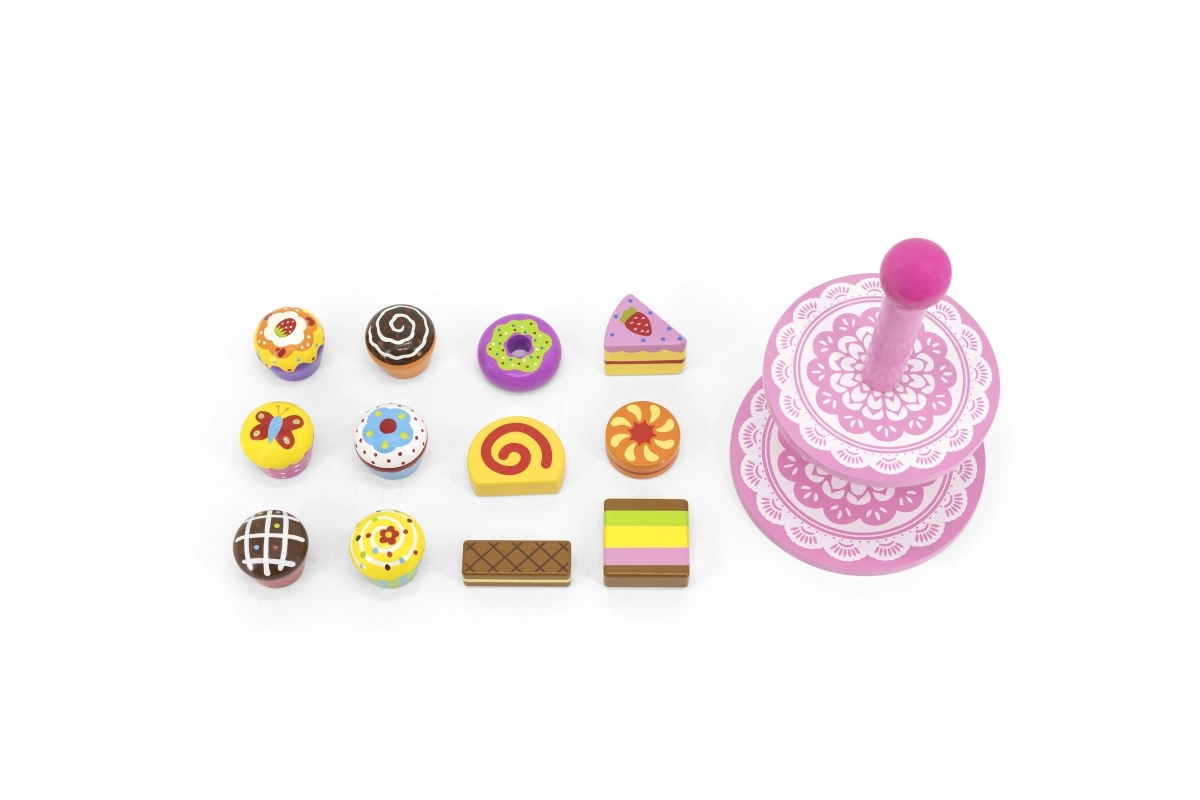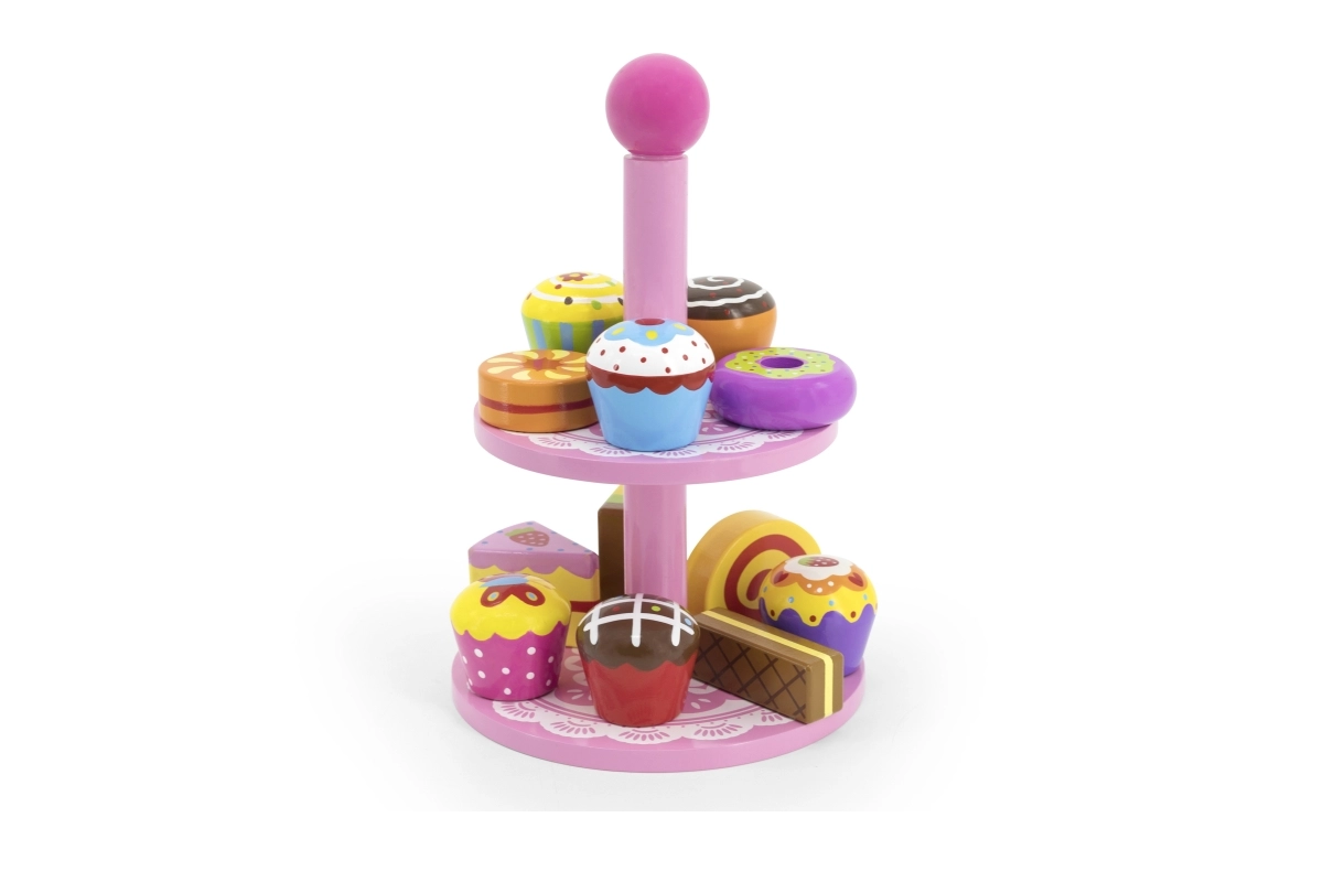 Ten stylowy zestaw drewnianych deserów na dwupoziomowym stojaku jest idealny do zabawy w kawiarnię, podwieczorek lub dziecięcą cukiernię. Starannie wykonane drewniane elementy w żywych kolorach zachęcają do odkrywania i ćwiczą koordynację ręka–oko.