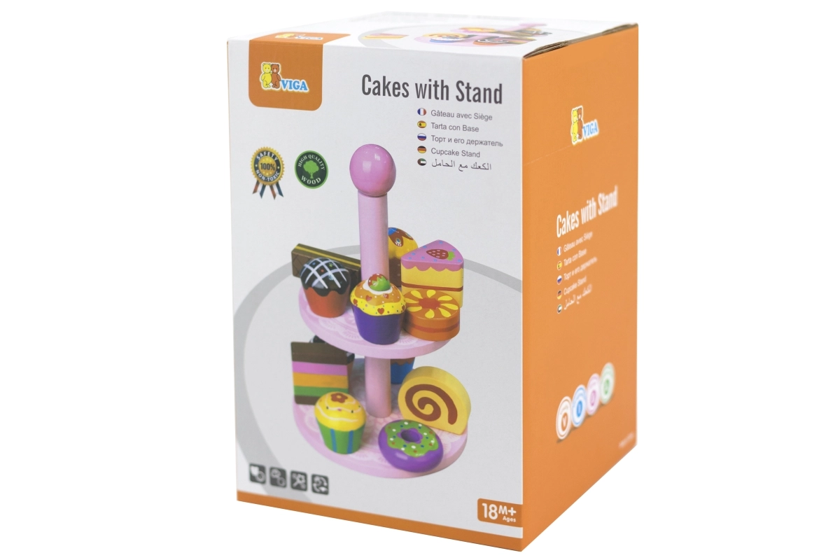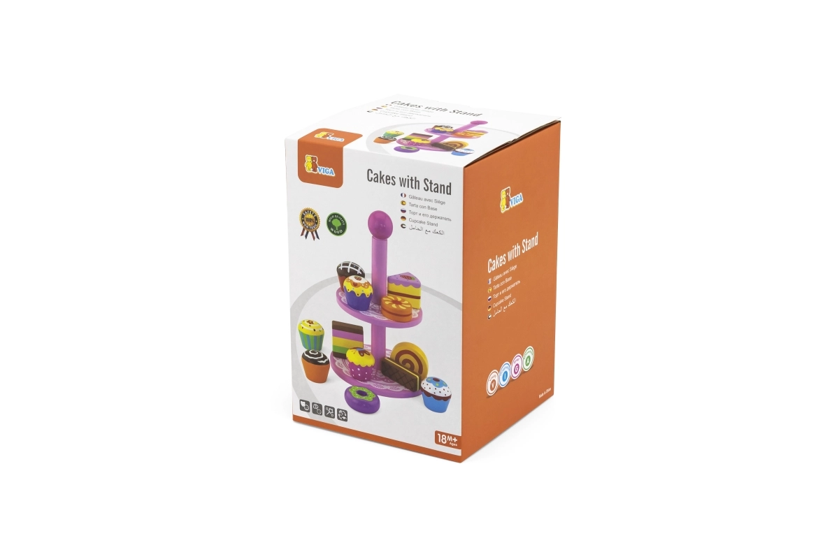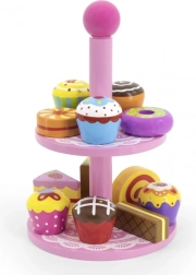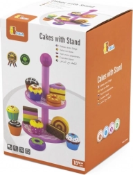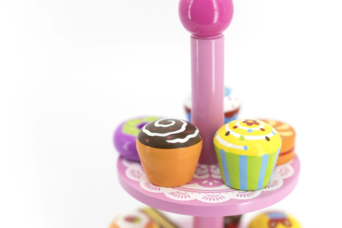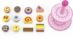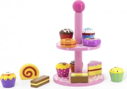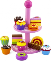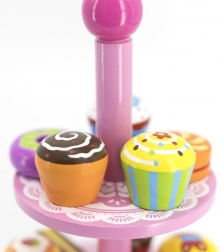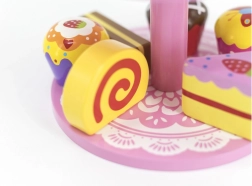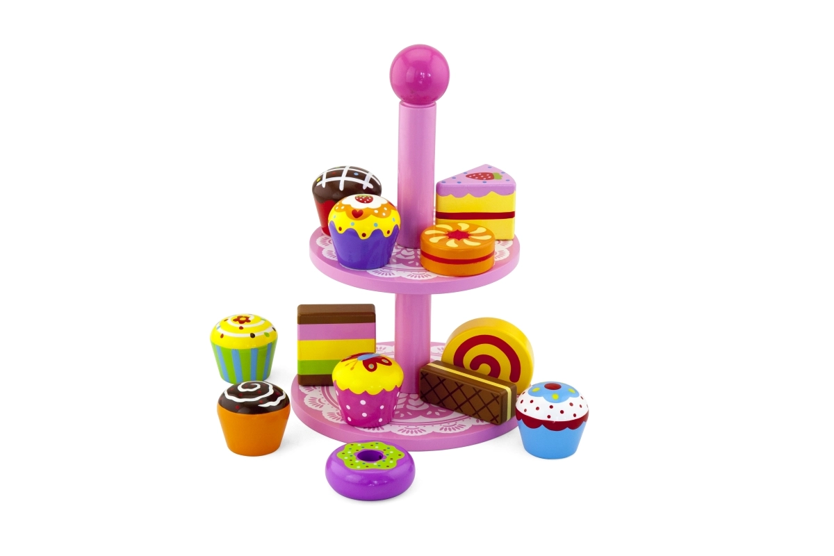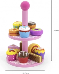 Ten stylowy zestaw drewnianych deserów na dwupoziomowym stojaku jest idealny do zabawy w kawiarnię, podwieczorek lub dziecięcą cukiernię. Starannie wykonane drewniane elementy w żywych kolorach zachęcają do odkrywania i ćwiczą koordynację ręka–oko.