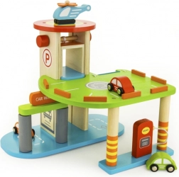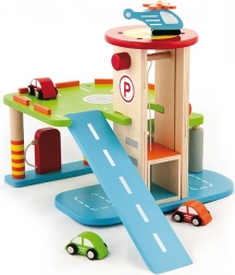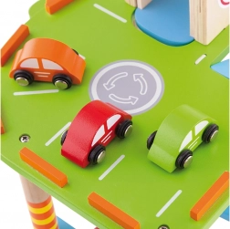 Ten wysokiej jakości drewniany garaż oferuje wielopoziomowe parkowanie, lądowisko dla helikoptera oraz praktyczną windę do łatwego przemieszczania autek między piętrami. Dzięki przemyślanemu projektowi z drogami, znakami i dodatkami dzieci ćwiczą koordynację ruchową i rozwijają wyobraźnię.