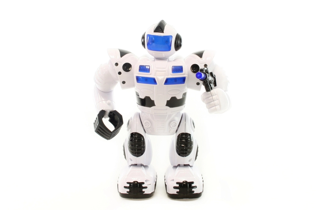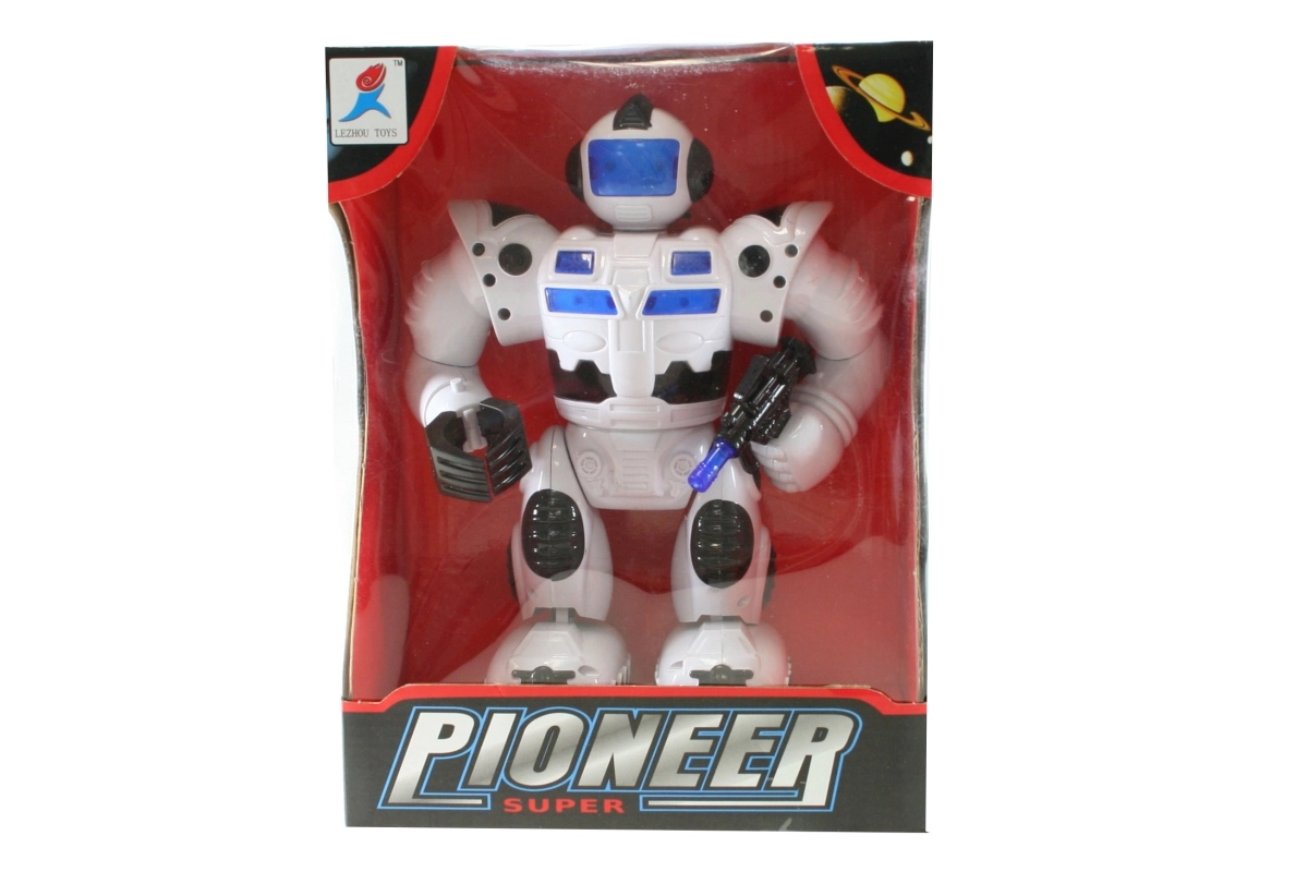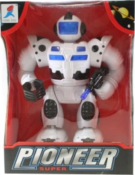 Robot na baterie chodzi, świeci i wydaje dźwięki, porusza rękami i głową. Zasilanie: 4x bateria AA (brak w zestawie). Wymiary robota ok. 23 x 17 cm. Wiek 3+