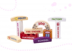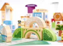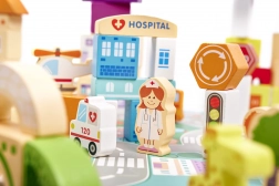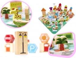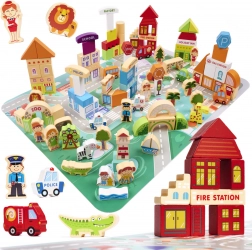 Ożyw kreatywność swojego dziecka z tą niezwykle kolorową drewnianą układanką zawierającą 120 elementów, idealną do tworzenia miejskiego środowiska. Kompletny zestaw obejmuje budynki takie jak szpital, fabryka, hotel, stacja paliw i straż pożarna, co pozwala dzieciom odkrywać i rozwijać ich wyobraźnię.