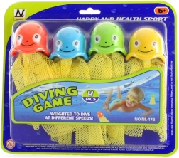 Zabawny zestaw nurkowych ośmiorniczek dla dzieci od 6 lat zapewnia radosną formę treningu w wodzie. Cztery kolorowe ośmiorniczki z różnymi oznaczeniami liczbowymi wspierają punktację i rywalizację, idealne do uatrakcyjnienia treningu pływackiego i nurkowego lub zabaw w przydomowym basenie pod nadzorem osoby dorosłej.