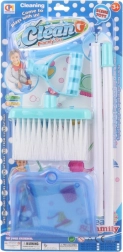 Plastowy zestaw sprzątający dla dzieci, który zawiera szufelkę i zmiotkę z długim uchwytem. Świetna zabawka dla małych pomocników.