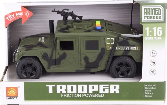 Realistyczny wojskowy samochód na baterie ucieszy każdego małego kierowcę. Po naciśnięciu przycisków wydaje dźwięki i świeci, ma otwierane drzwi oraz kompaktowe wymiary idealne do zabawy w domu i na zewnątrz. Zasilanie zapewniają dołączone baterie AG13. Odpowiedni dla dzieci od 3 lat.