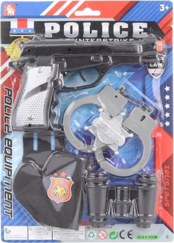 Zabawny policyjny zestaw dla małych bohaterów zawiera wszystko, co potrzebne do dynamicznej zabawy: plastikowy pistolet ok. 19,5 cm, kaburę na pistolet, plastikowe kajdanki, lornetkę oraz odznakę. Idealny dla dzieci od 3 lat, rozwija wyobraźnię i rolę policjanta.